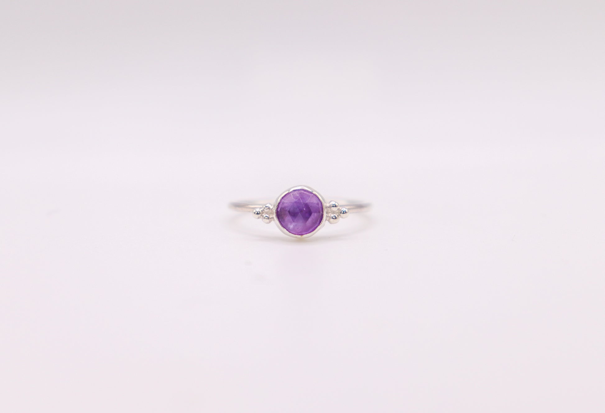 This dainty stacking ring features a pastel purple amethyst with beaded details