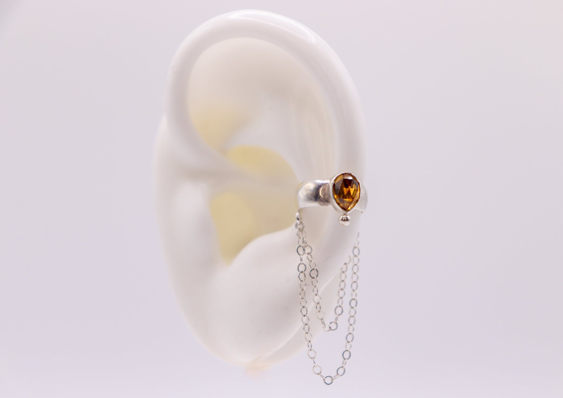 This ear cuff is a one of a kind piece made with a rose cut golden zircon stone. I bezel set the stone onto a heavy, silver band and draped delicate silver chains from its ends so that they wrap around your ear. This piece is currently only for sale at Wild Things Buffalo, but if you would like something similar feel free to reach out to me!