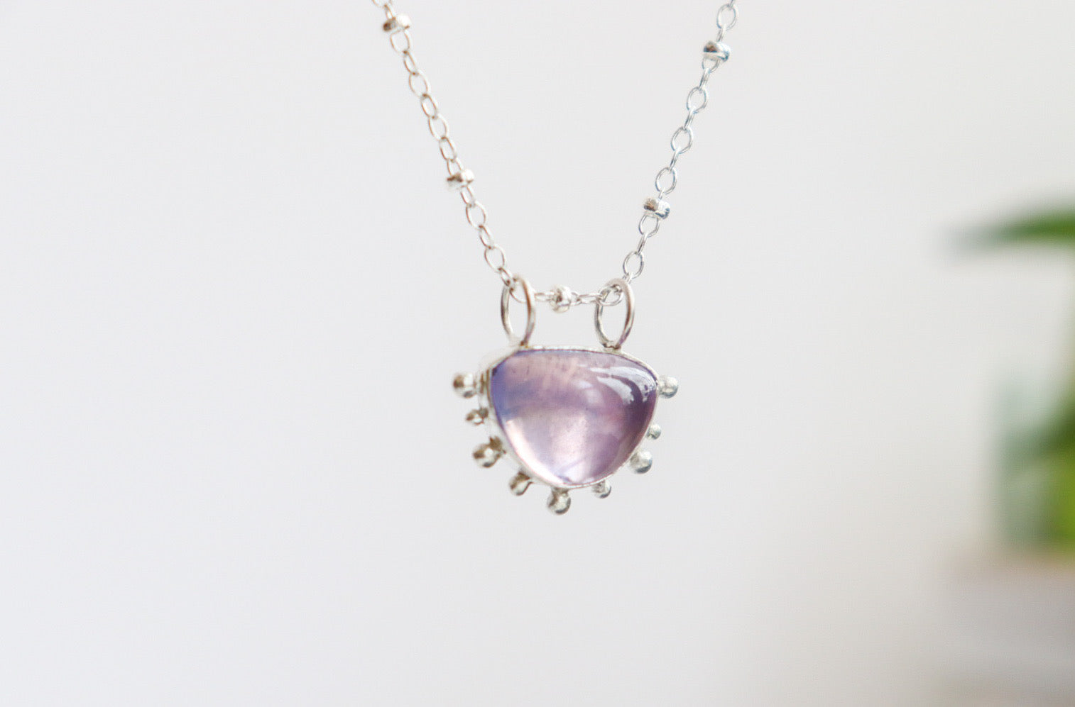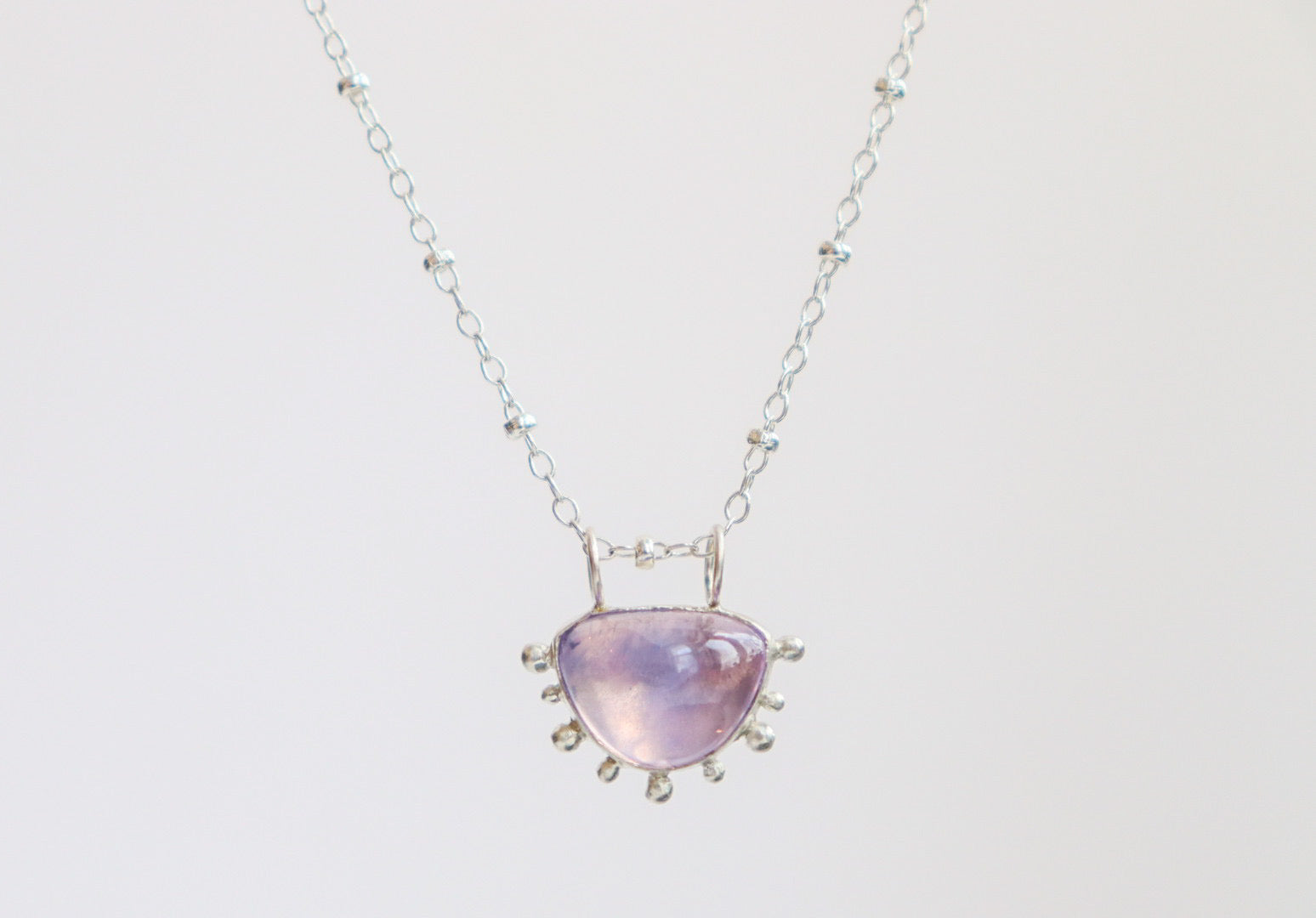 This dainty necklace features a juicy lavender quartz cabochon sent in a modified version of my bubble setting with a double bail. It its strung on a 16” sterling silver satellite chain and features a lobster clasp.