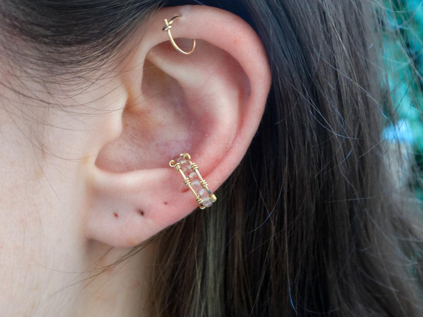 Introducing the Penelope Ear Cuff– a dainty, gold-filled cuff, wire wrapped with pink and magenta flecked 2mm faceted, strawberry quartz beads.
