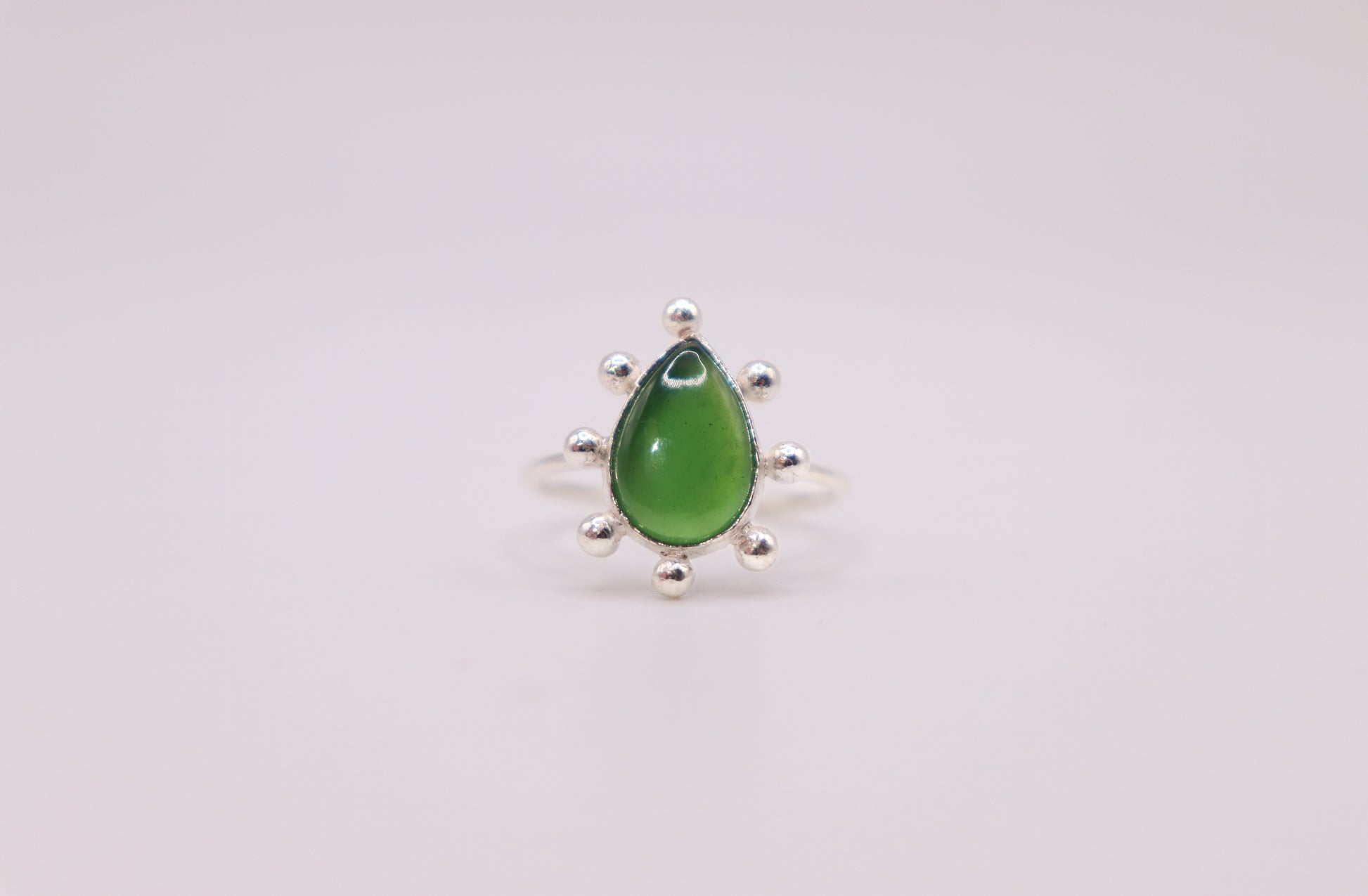 My signature solitaire bubble ring made with a fern green, pear-shaped serpentine set in sterling silver.